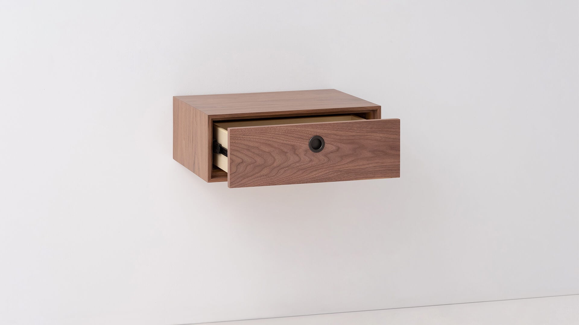Experimenting with a balance of substantial and small scale, the Replay collection blends function and flexibility. Floating nightstands allow for storage in any room without taking up much-needed space. Composed of walnut veneer with a powder-coated steel handle and side-mounted drawer glides.