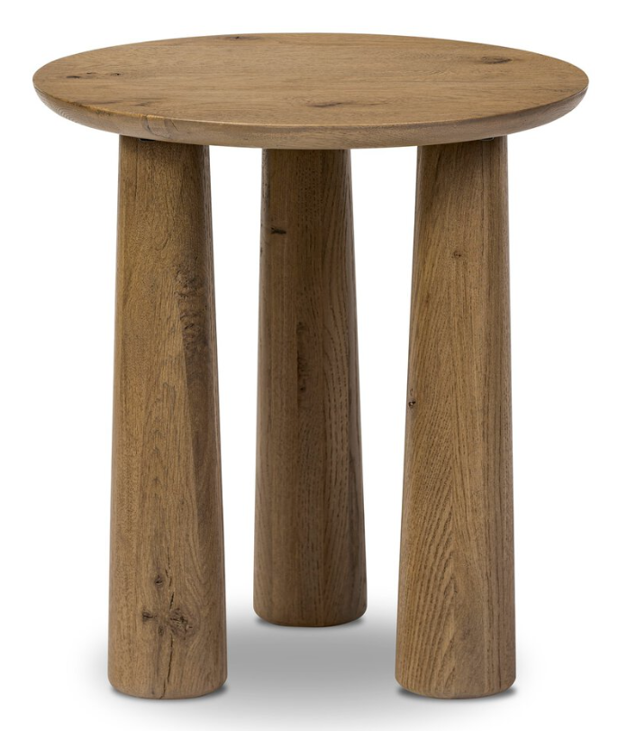 A chamfered top and tapered legs define the artisanship of this tall, three-leg end table. Crafted from drifted oak veneer, its natural texture and clean design make a clever addition to any room.