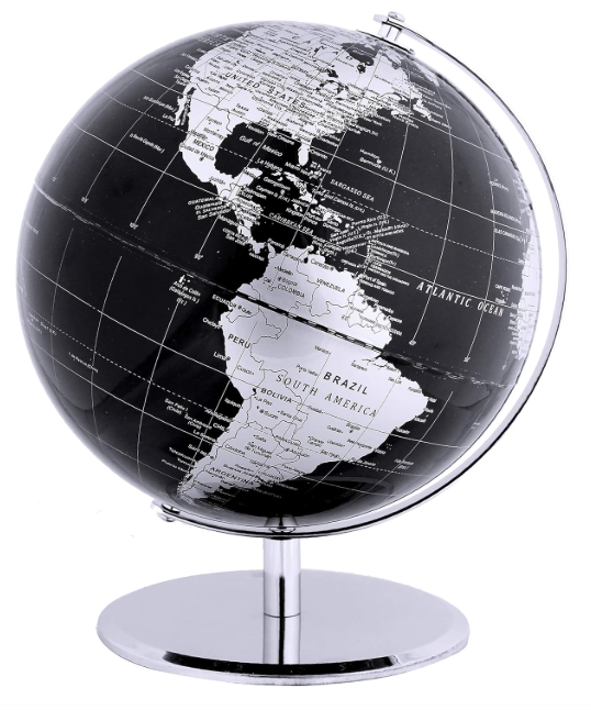 This 10-inch wide by 14-inch high metallic world globe features a sleek stainless steel design with a black finish. Its sturdy construction offers durability while serving as an elegant, sophisticated decorative piece. Ideal for both office and home settings, it provides a stylish way to explore geography and inspire global awareness.