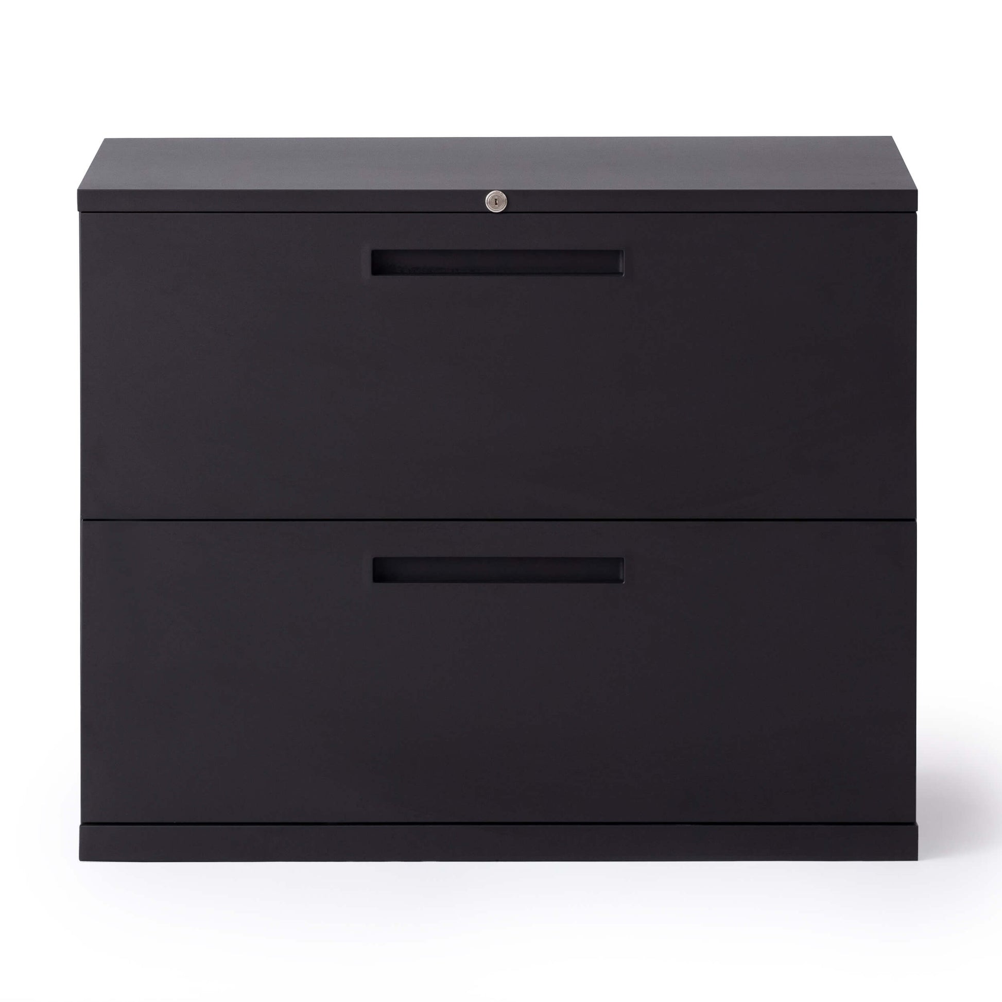 The Novah two-drawer filing cabinets provide file storage in a durable, metal powder-coated finish with both full-extension drawer glides and a locking mechanism allowing only one drawer to be opened at a time, for both safety and to prevent tipping.