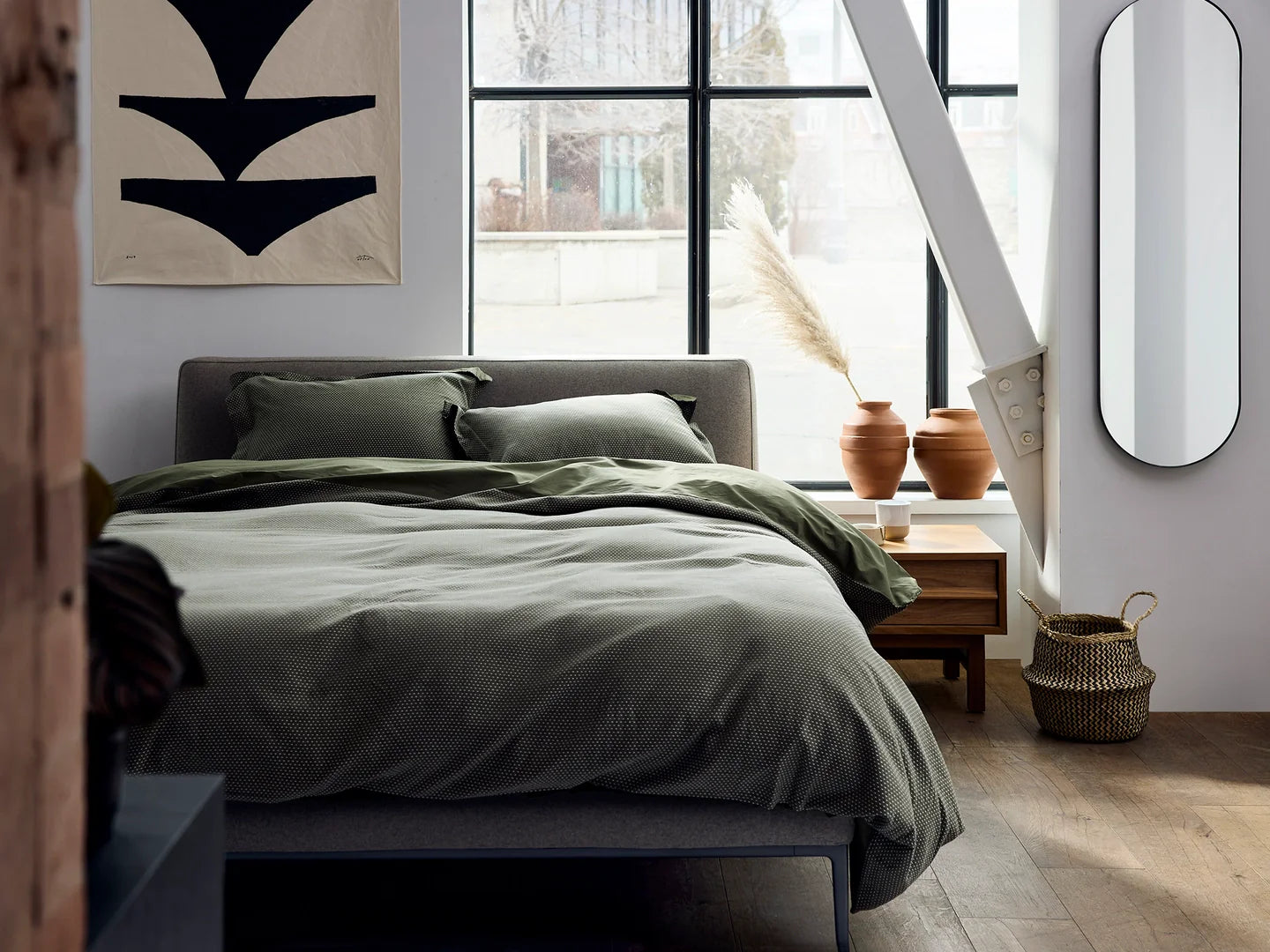 Slim and sophisticated yet structured for comfort. The Oma bed features the same footprint as the mattress that sits on it.