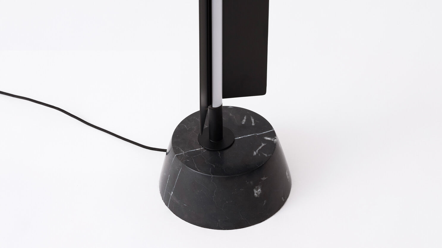 The Oxford lighting collection emanates sophistication and elegance. This unique floor lamp features a marble base with a matte anodized aluminum shade that can be directed against a wall to reflect a warm glow. The unique vertical shaft of light is the perfect addition to any bedroom or living space. Available in black aluminum or silver aluminum.