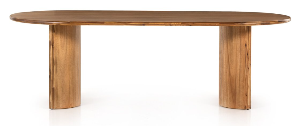 A study in shape. Sandy brown acacia forms crescent-shaped legs and sprawling oval tabletop, bringing organic presence to the living room.