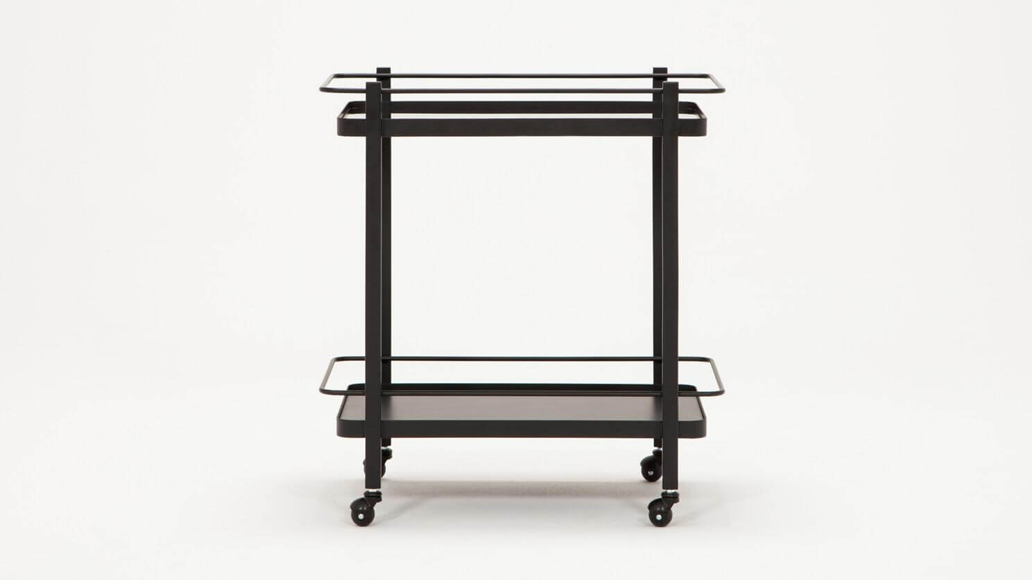 Fun and flexible. The Perrier Bar Cart fits into any small space with ease. sitting on black castors, the thin tubular metal frame supports either black glass, or black melamine shelves. Terrific as a mobile bar, the Perrier Bar Cart can also be used to store books, magazines, vases and small objects.