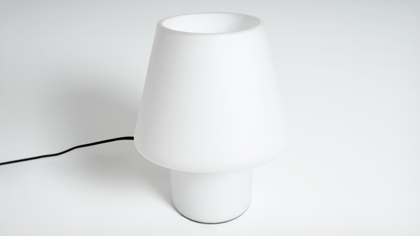 The Pinkie Lamp emits a soft glow through its opal matte glass surface. Its playful shape adds character to any space.