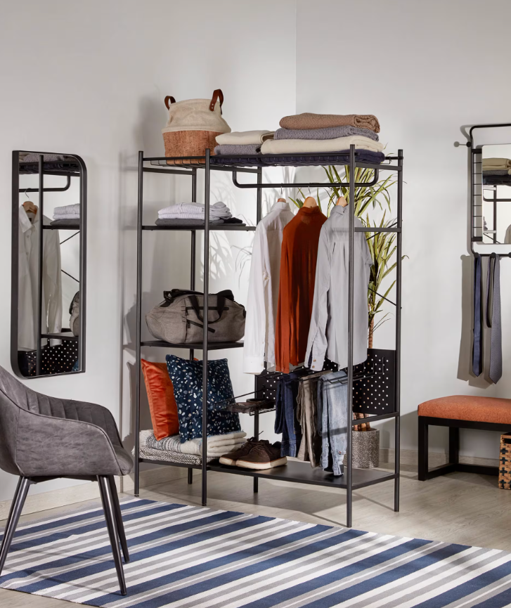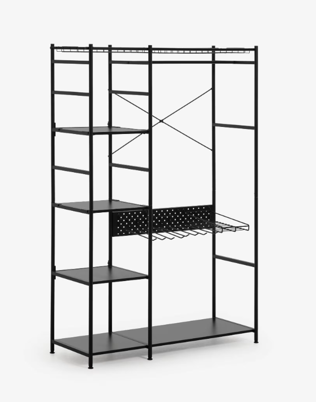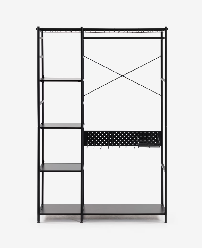 This doorless closet is a steel structure spray painted in black with four racks at different heights and hooks for both your trousers and shirts. The perfect combination and distribution for storing all kinds of clothing and accessories. Design is useful.